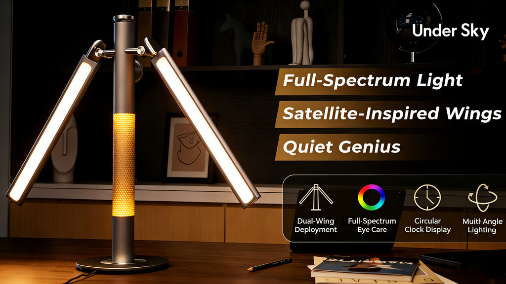 A satellite-wing lamp with full-spectrum eye-care lighting, CNC-machined aluminum body, 1800K sleep glow, and a premium clock display.