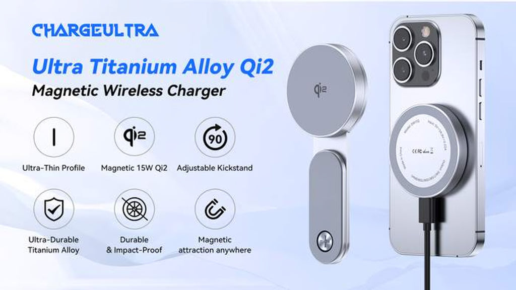 Wireless 15W Fast Charger, Ultra-Durable Titanium Alloy Shell, MagSafe & Qi 2 Compatible, Portable Design, 3M Ultra Adhesive Bracket