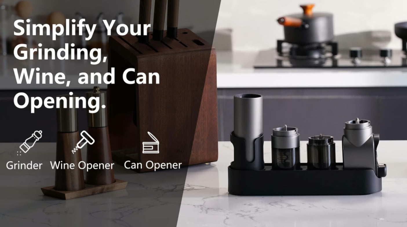 Electric Grinder, Wine Opener, Can Opener. Combining three essential kitchen tools you rarely use but always need.