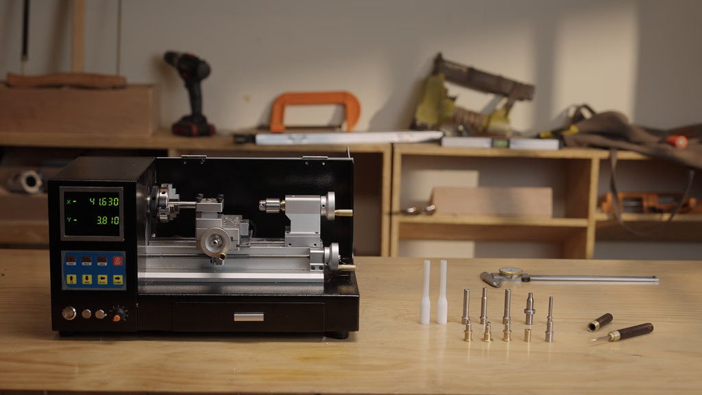 A powerful, precise hand lathe with a digital micrometer, speed control up to 8000 RPM, and a safe, clean working experience