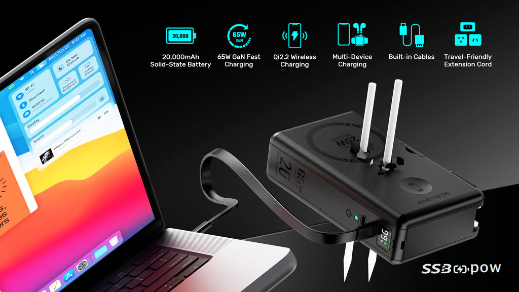 Fire-Resistant Solid-State | 65W GaN | Qi2.2 | Dual Built-in C-to-C & Lightning | Built-in Plug + Desk-Length Extension | Hidden Stand
