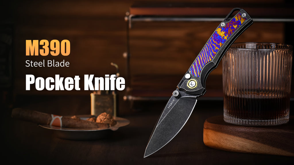 “Black Warrior ", Titanium Inlaid Timascus Handle | M390 Blade | 60-62 HRC Hardness | One-Hand Use |