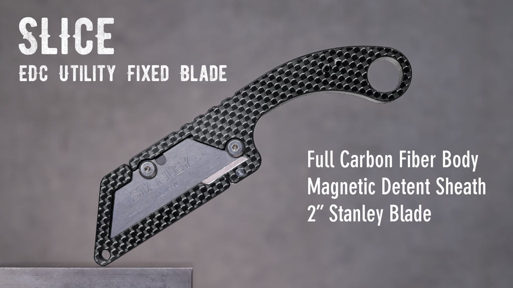 The SLICE is a compact utility blade knife with a magnetic detent sheath. Both the sheath & Handle are milled from solid Carbon Fiber
